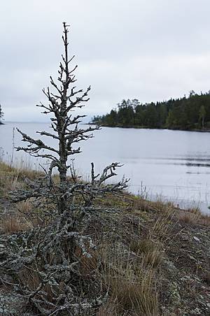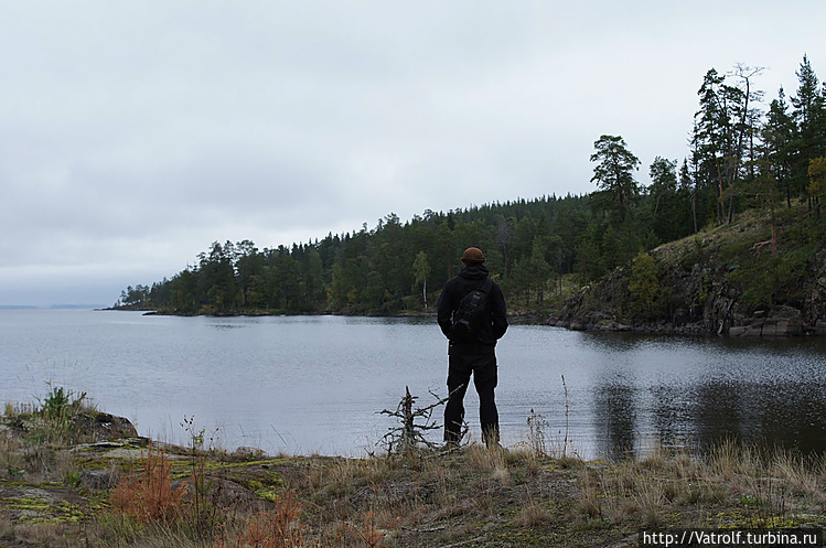 Очередной оху... потрясающий взор вид: стоя на крошечном плоском каменном островке, наблюдаем уходящее до горизонта озеро. Вдалеке виднеются очертания островов. Справа скалистый берег, покрытый старым лесом.