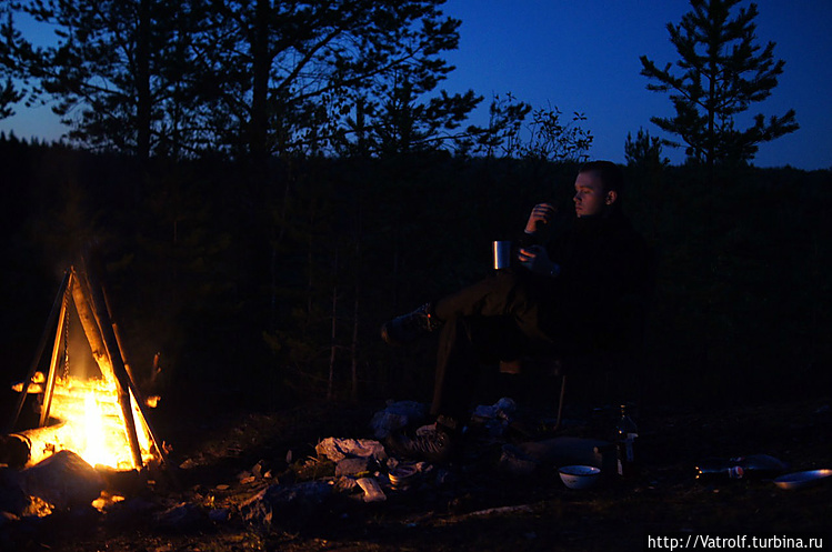Санчес и Тёма выдумали и соорудили удочку из части каркаса палатки. Где смекалка и сноровка, там и палка – что винтовка. Этим девизом воспользовался и я и начал разжигать костёр с помощью лупы. Но моя «винтовка» не выстрелила. Единственное объяснение этому – низкая активность Солнца. В то время, когда Санчес терроризировал обитателей озера, я всё же воспользовался зажигалкой. Но и тут всё вышло не с первого раза. Позже подошёл Тёма и продолжил обкладывать дровами занимавшийся костёр.