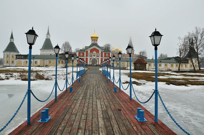 С городской набережной его прекрасно видно. Монастырский комплекс и в начале весны смотрится довольно эффектно: купола церквей словно парят над белой гладью замерзшего озера. Летом к картинке добавится густая зелень деревьев и прозрачность воды…