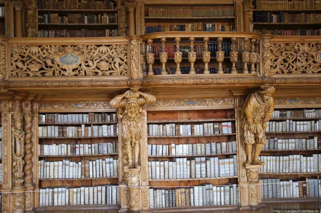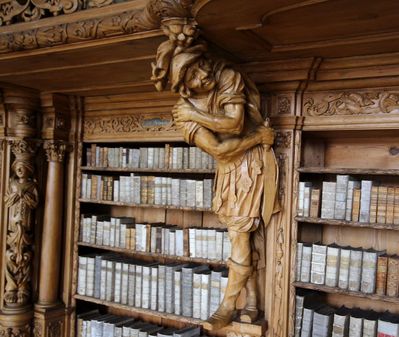 Вот эти, большие, выше человеческого роста деревянные скульптуры, которые стоят между книжными шкафами и на плечах держат верхнюю галерею? Это же шуты! Настоящие шуты или дураки. Что это?! Монастырский библиотечный зал или корабль дураков?! Как же его ещё назвать, если главные персонажи художественного оформления зала — шуты?