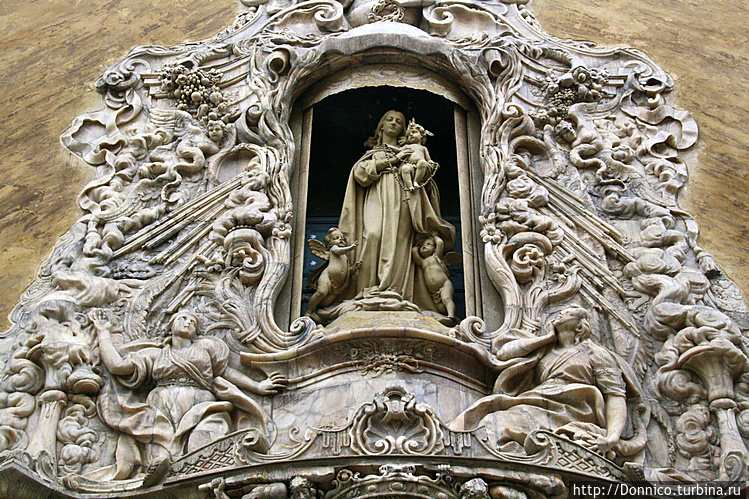 Название Dos Aguas творчески воплотилось и на роскошном (рококошном) центральном портале здания, где источник сходит вниз двумя реками от Девы Марии по правую и левую сторону портала, где каждую из рек символизирует один из Атлантов...