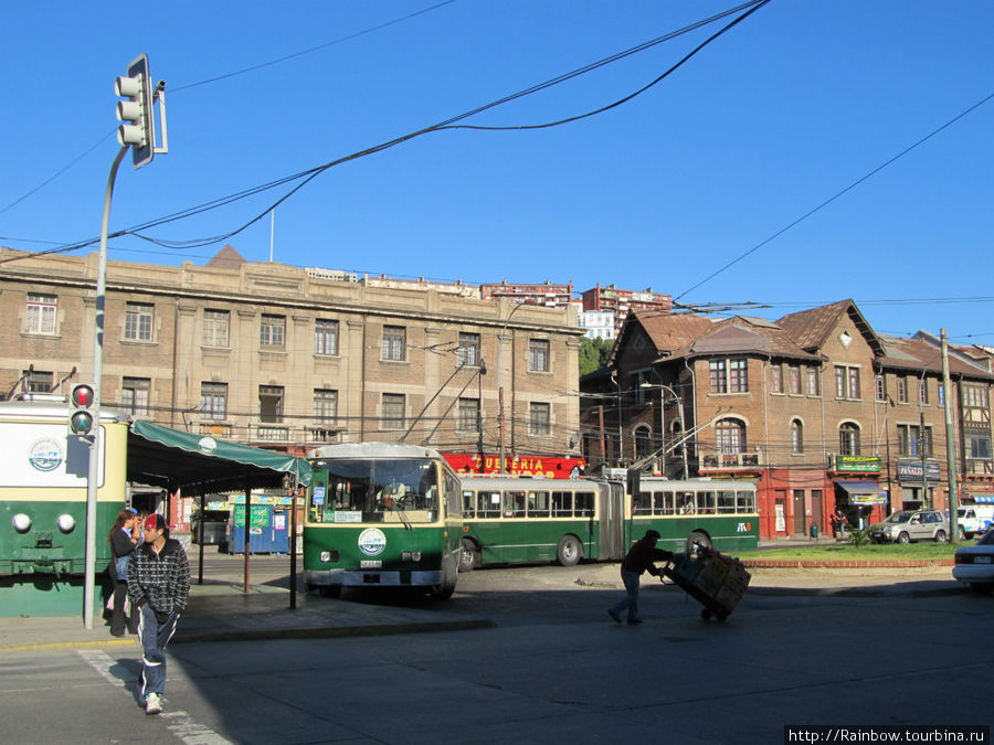 Городской автовокзал Вальпараисо вызвал недоумение. Расположен был на задворках, было грязновато, снимки сделать не удалось ( а зря!). Девушка в информационном окошке знала на английском только одно слово — О'кей. Пришлось слушать испанский. Если так будет и дальше всю поездку? Может и начнем понимать? Путеводители обещали нам уникальность — прокатиться по городу на историческом троллейбусе.
