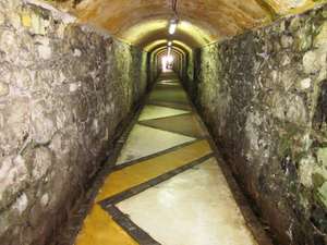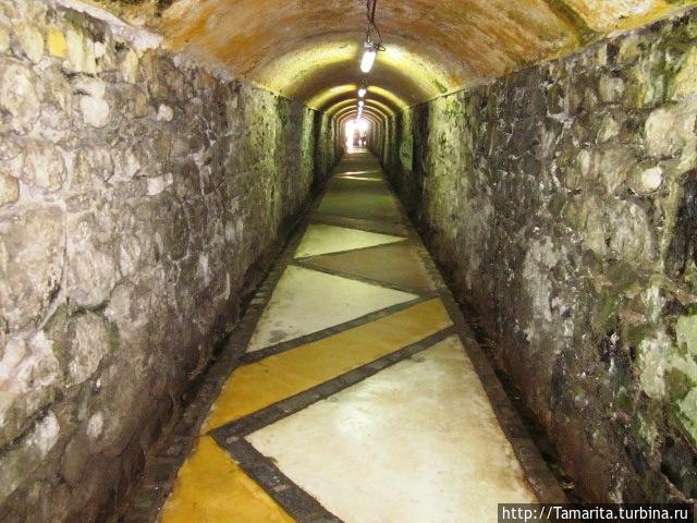 Тоннель достаточно хорошо освещён, а пол выложен яркой плиткой, в конце пути что-то вроде небольшого бассейна, огороженного камнем.