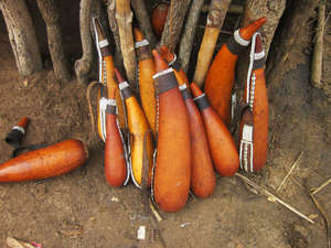Чистят калабосы каждый вечер при помощи размочаленной на конце палки. Жёны главы моей общины, где я жила, садились каждый вечер у костра и занимались этим каждодневным делом, дружно напевая дуэтом. После помывки тыквенные сосуды обжигались изнутри горящими палками из очага. Поэтому молоко всегда, приятно пахло костром.