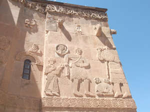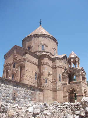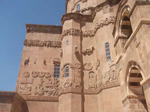 Ахтамарский дворец, который не сохранился до нашего времени, был окружён другими сооружениями, из которых сохранилась только церковь Святого Креста, построенная архитектором Мануэлом между 915 и 921 гг. Церковь представляет собой несколько видоизмененное в плане здание традиционного центральнокупольного типа. Внутри церковь была расписана фресками, но она особенно знаменита своими рельефами, расположенными на наружных стенах и на барабане купола, которые отличаются оригинальностью и разнообразием сюжетов. Связь между архитектурой и скульптурно-декоративным убранством Ахтамарской церкви основана на новом художественном принципе, чем отличался от сооружений 6-7 вв. Хотя часть рельефов по традиции и располагается по карнизам, на бровках ниш и окон, главная их масса помещена непосредственно на плоскости стены.