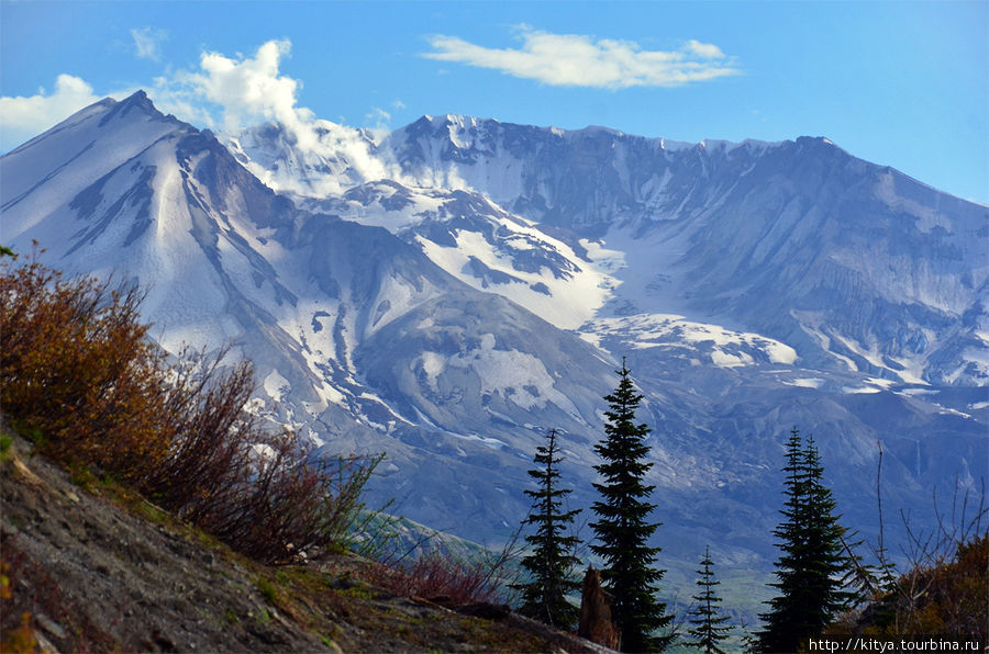 Штат Вашингтон, конечно, не столько холодный, сколько мокрый. В горках-холмиках Каскадного хребта альпийская зона начинается на высоте 1500 метров. В тенистых местах на 1700 уже лежат ледники. Не то чтобы там было сильно холодно. Просто снега падает больше, чем тает. Но вот среди низких горок стоят, обособившись, несколько местных вулканов-великанов. Белый Стражник Кома Калшан на границе с Канадой. Одиноко прячется Тдакобауба, Вершина Ледников. Такома, Матерь Вод, виден солнечными летними днями даже из города Сиэтл. Нежный Гигант Пахто прячется у южной границы, а через реку от него Выст. И, конечно, Ловала-Клух — Дымящая Гора*.