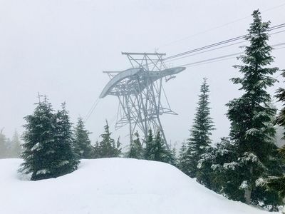 Горнолыжный курорт мирового класса на заднем дворе).Там, откуда в солнечный день можно было бы увидеть с высоты орлиного полета весь Ванкувер, лежали 2-метровые сугробы снега и то, что падало еще 15 минут назад внизу проливным дождем, здесь сыпалось за шиворот снегом.