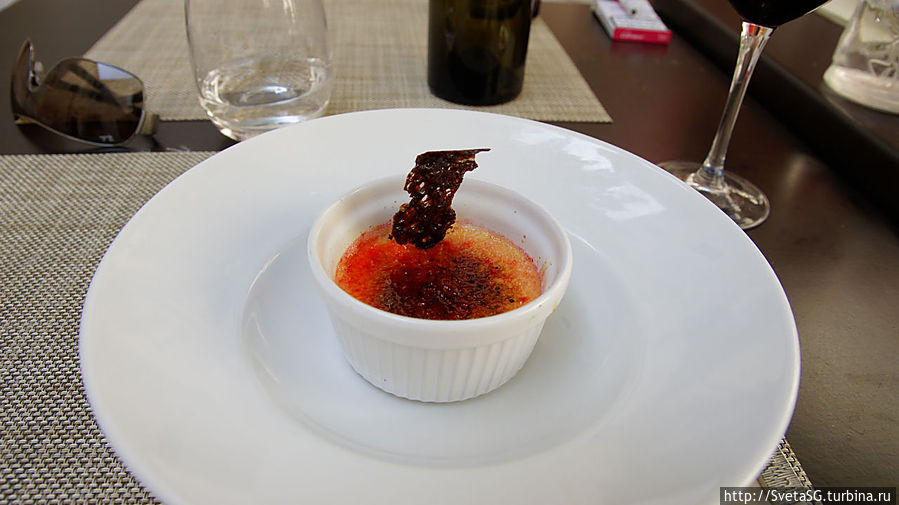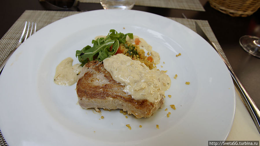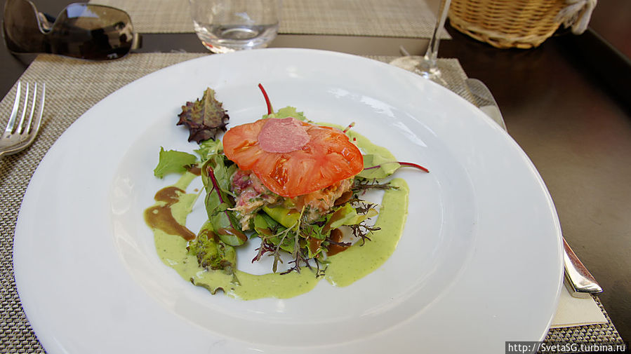 В общем на обед у них что-то типа комплекса. За 20 евро с носа можно выбрать одну из трех закусок, горячее и дессерт. Графин с простой водой бесплатно. Но кто ж в таком ресторане воду пьет? Выбрали бутылочку вина. Оно было восхитительно!