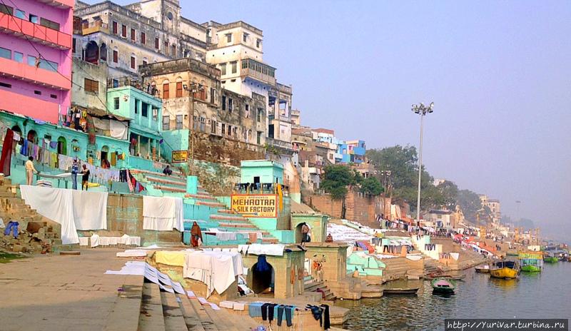 Пройдя еще ниже по течению, увидели повседневный быт жителей – стирку и сушку белья, купание себя и детей в мутных водах священной реки. Стирали белье просто и по старинке – намылив, выбивали из него грязь палкой или ударяли по многу раз свернутой в жгут простыней об камень. Выстриранное белье тут же раскладывалось на каменные ступени гхатов.