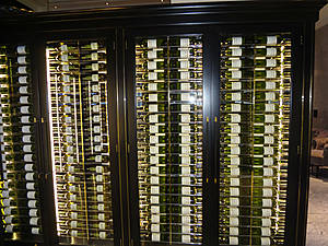 Холл отеля и кафе разделяют витрины с огромным количеством вина.