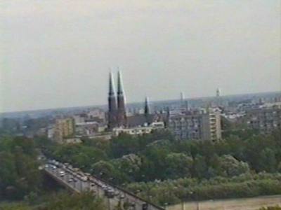 Эта экскурсия была запечатлена на видеоплёнке, что позволило мне дополнить свой репортаж следующими кадрами: мы видим Рынок Старого Мяста. Эти дома, к со-жалению, представляют собой новодел, так как во время войны центр Варшавы был разрушен. Однако они хорошо передают атмосферу средневекового города, так как их прототипы были построены в XVII-ом веке. Площадь занята многочисленными кафе, и мы видим разноцветные зонтики и характерный фонарь на переднем плане.