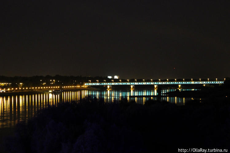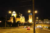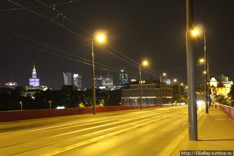 Шоу фонтанов в Варшаве), который очень хвалили особенно за вечернюю подсветку, но, признаюсь, в спешке мы посмотрели лишь общее направление и, как выяснилось позже, не дошли до него совсем чуть-чуть. А тогда мы решили, что идём не в ту сторону и постановили идти... в противоположную:) Логично, да?:) Снова миновали Замковую площадь, где нам встретились девушки-цветочницы в национальных платьях, которые сновали тот тут, то там среди гуляющих и предлагали красные розы, лежащие в плетёных корзинах, перекинутых через предплечье. Для меня, признаюсь, это явление до тех пор "в живую" было незнакомо. Может быть поэтому запомнилось с позитивной окраской, ибо девушки продавали цветы очень ненавязчиво, скорее придавая колорита происходящему. Цена на розы была высоковата для Польши, но вполне среднероссийская, а концы стеблей были заботливо укутаны фольгой, чтобы цветы не завяли. Розы достаточно активно раскупались мужчинами и дарились всем подряд — кто приглянулся. А мне они вспоминаются достаточно острыми шипами, которые кололи руки весь остаток вечера:) И вот, спустя некоторое время, мы оказались на Слензко-Домбровском мосту через Вислу. Этот мост имеет пешеходные тротуары, а транспорта ночью мало. Навстречу нам попалось несколько гуляющих пар да велосипедистов. Мост высок, так что смотреть вниз на реку с него страшновато. И изрядно вибрирует, когда по нему проходит трамвай. Но всё это компенсируется открывающимися видами. Красиво смотрится подсвеченный королевский дворец. А вот и знакомый нам костёл св. Анны. А ещё мост запомнился запахом воды и тонким ароматом цветущих лип (но это уже ближе к его окончанию). В общем, мы уже понимали, что фонтанов нам не видать, однако, раз уж дошли сюда, то грех было бы не перейти дорогу, чтобы посмотреть поближе Кафедральный собор Святого Архангела Михаила и Святого Мученика Флориана (координаты тут