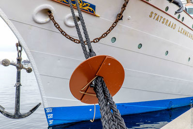 14. В порту подготовился к зимовке учебно-туристический парусник из Швеции. На швартовах повесили защиту от крыс. Повоевав с тварями на Гавайях и немного изучив их возможности, авторитетно заявляю: взрослая, опытная крыса перелезет через эту тарелку не моргнув глазом, а небольшая молодая — в отверстие между канатами и диском.