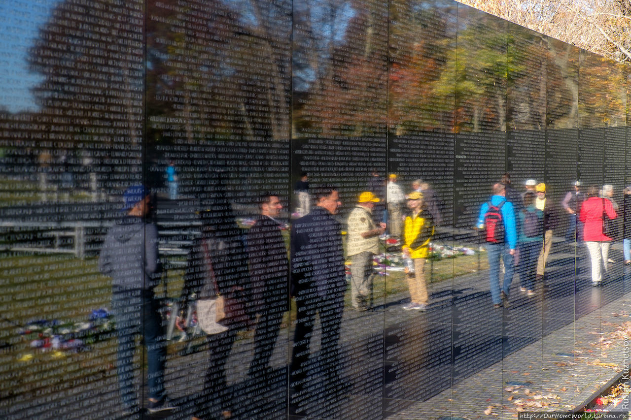 75. Всегда поражают визуальные примеры давно знакомых цифр. Прочитал, что во Вьетнаме погибло 58.307 американских солдат, сморщил брови, пытаясь понять, сколько это, не понял и забыл. А потом наталкиваешься на мемориал в виде длиннющей черной стены с именами и вдруг замираешь от осознания масштаба. Потому что ты постоял около одной секции, почитал-почитал фамилии, потом устал читать и пошел себе дальше. Уже об одном поговорили, о другом — а стена в серую полоску все идет и идет слева, и никак не закончится. И шагу не прибавить, и терпеть ее уже больше не хочется. И ведь это только имена и фамилии. А если бы усадить всех этих молодых ребят амфитеатром в двадцать рядов по обе стороны дорожки и они бы просто сидели и смотрели на нас...
