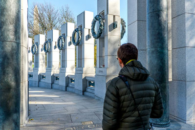 А здесь мемориал участникам и погибшим во Второй Мировой войне. Каждому штату — стела с венком. За живых и мертвых, за воевавших там и трудившихся здесь. Шестнадцать миллионов мужчин и женщин из пятидесяти штатов пошли защищать свою страну от японцев и помогать освобождать остальной мир от немцев. Четыреста тысяч не вернулись домой, шестьсот вернулись, но с ранениями. А еще все это время дома работали те, кто остался, чтобы отправлять в Европу корабли с грузами продуктов, материалов, оружия, боеприпасов, танков, самолетов и т.д. (в пересчете на сегодняшние цены штаты помогли англичанам, русским, французам и китайцам примерно на 700 миллиардов долларов).