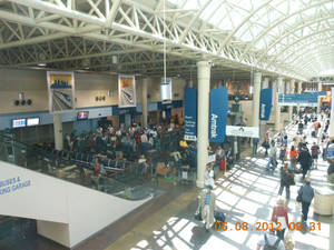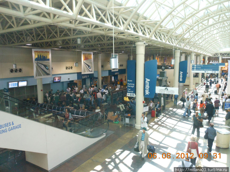 Больше похож на аэропорт: стойки регистрации, ленты выдачи багажа, выходы к поездам и рестараны, магазины