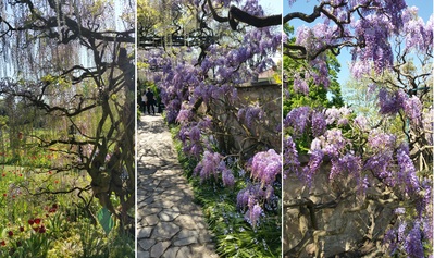 На сайте Херманнсхофа всегда пишут, что цветет в саду в данное время. Это очень удобно, если хочешь посмотреть конкретные цветы, в нашем случае это были глицинии. Глицинию немцы еще называют Блауберген, т.е. голубые горы. Глициния относится к семейству бобовых, она несьедобная и даже ядовитая. Особенно ядовиты семена и кора. В Китае и Японии, родине этих лиан, говорят, что глициния — это одеревеневший дракон, вместо огня извергающий ядовитые цветы.