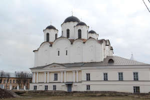 Когда попадаешь в реальный Новгород, живо представляешь его величие, ведь архитектурный комплекс – Ярославово дворище и Торг поражают размахом даже сегодня. Издали гордо виднеются: соборы, церкви, колокольни, гостиный двор, воротная башня и многое другое. Ярославово дворище получило своё название в честь князя Ярослава Мудрого.Главное место среди памятников зодчества новгородского Торга занимает Николо-Дворищенский собор (1113 г.), где находилось ещё девять церквей. Он представляет собой обширную парадную постройку домонгольского периода – пятиглавый, шестистолпный храм. Никольский собор соединялся с деревянным дворцом Ярослава в XI веке; князь вместе с семьей присутствовал на службе,занимая второй ярус с балконом, построенным специально для него. В первые годы основания стены собора расписали фресками. Они находятся на реставрации. От подлинной росписи вследствие многочисленных пожаров и ремонтов уцелело совсем немного. Например, изображение сюжета «Страшного суда» – часть фигуры Сатаны, восседающего на чешуйчатом звере в углу, увитые змеями ноги грешников.