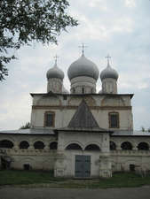 На фотографии слева- направо видны церковь Параскевы Пятницы на Торгу, Никольский собор, правее — церковь Жен Мироносиц. Известен факт, что археологам так и не удалось найти остатков княжеского дворца. Вполне возможно, что построенный в 1113 г.. Никольский собор возник и в самом деле прямо на его месте. Мы обходим каждую церковь (позднее в составе экскурсионной группы мы узнаем много подробностей о каждой).