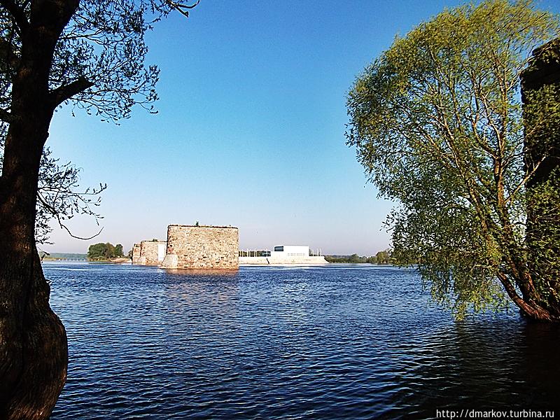 Когда-то в начале ХХ века здесь планировали провести железную дорогу Валдай-Новгород, да не провели. Насыпь со временем поросла травой и деревьями, а опоры моста через Волхов так и стоят до сих пор (3).