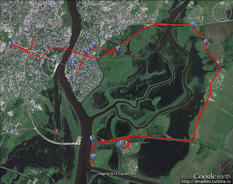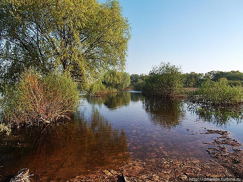 Дальше мне надо было пройти по мосту через протоку, и я на Городище (так говорила карта). Однако следов моста не обнаружилось, вместо этого передо мной дорога, вымощенная плитами, уходила под воду. Правда через метров 20 появлялась вновь. Ну, если здесь благоустроенная дорога, значит должно быть неглубоко. Закатал штанины, кроссовки в руки — и вперед! Вода в становящийся жарким денек приятно освежала, а глубина действительно была сантиметров 30. Прошел за поворот, новое «море» — длиной уже метров 150–200. Хорошо Волхов разлился! Пойду, пока «по шею не станет», что я — зря приехал? Максимальная глубина — на 10 см выше колена, прошел, обсох, я на Городище (4)!