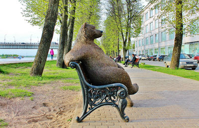 В Великом Новгороде на набережной напротив городской бани сидит, никого не трогая, бурый медведь. Сидит давно, вероятно, остывает после парной.