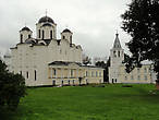 В Юрьев монастырь приехали мы из Перынского скита. Это совсем близко, ехали несколько минут. Объект культурного наследия ЮНЕСКО, Юрьев монастырь находится на берегу Волхова, совсем недалеко от того места, где он вытекает из оз. Ильмень. Здесь, перед входом, мы остановились, экскурсовод рассказывала нам о Городище, расположенном на другом берегу Волхова. Новгород, буквально новый город, не стали выдумывать название, когда перенесли город. А значит был и старый город.