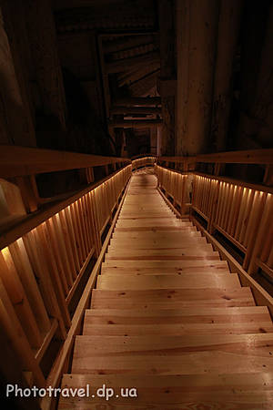 По ступеням переходим в камеру Пескова Скала. Именно эта камера соединяет первый и второй уровень копей. Туристы идут по новой деревянной лестнице, но слева проглядывают старые ступени выдолбленные в соли.