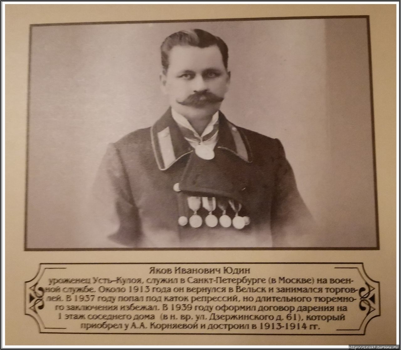 Сохранилась купчая о продаже Степаном Павловичем Крестьяниновым Анне Юдиной недвижимого имения: «...состоящее в городе Вельске по Вологодской улице в десятом квартале №136 дворовое место земли 420 кв. сажень (1119,96 кв. м.) с находящимся на нем двухэтажным домом, двором и другими без остатка постройками…» «Выпись из крепостной Вологодского нотариального архива книги по городу Вельску за 1905 год №612. 5 апреля».