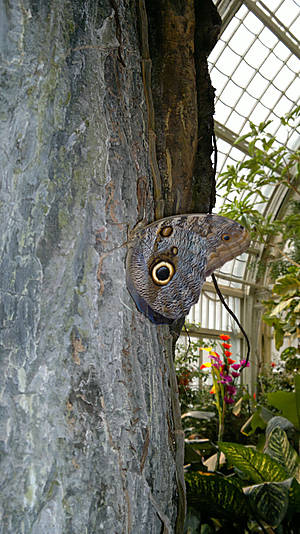 Сразу не видно бабочек, но когда немного пообвыкнешь, присмотришься, то замечаешь их повсюду: они хоботками сосут нектар — приготовленную для них пищу (яблоки и бананы), скрываются среди стволов деревьев и зелени, просто сидят на подоконниках и вдоль окон (может им жарко?).