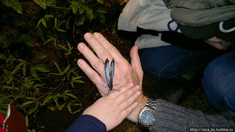 Мы купили билеты, повесили верхнюю одежду на вешалках, прошли турникет и попали в теплую страну с удивительными запахами, журчанием воды, аквариумом с рыбками, пением птиц и БАБОЧКАМИ.