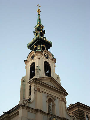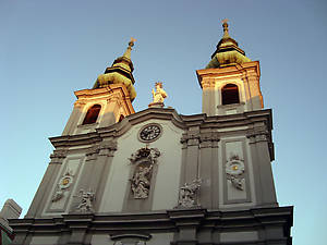 Мы идем по Mariahilfer Straße к центру города. И разве не совпадение, что в первый кадр Вены попала Mariahilfer Kirche, т.е паломническая церковь "Успение" возникшая в 1656 году места Michaelerkirche, купола которой позолотило вечернее солнце.