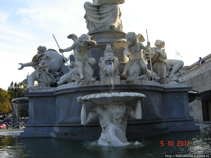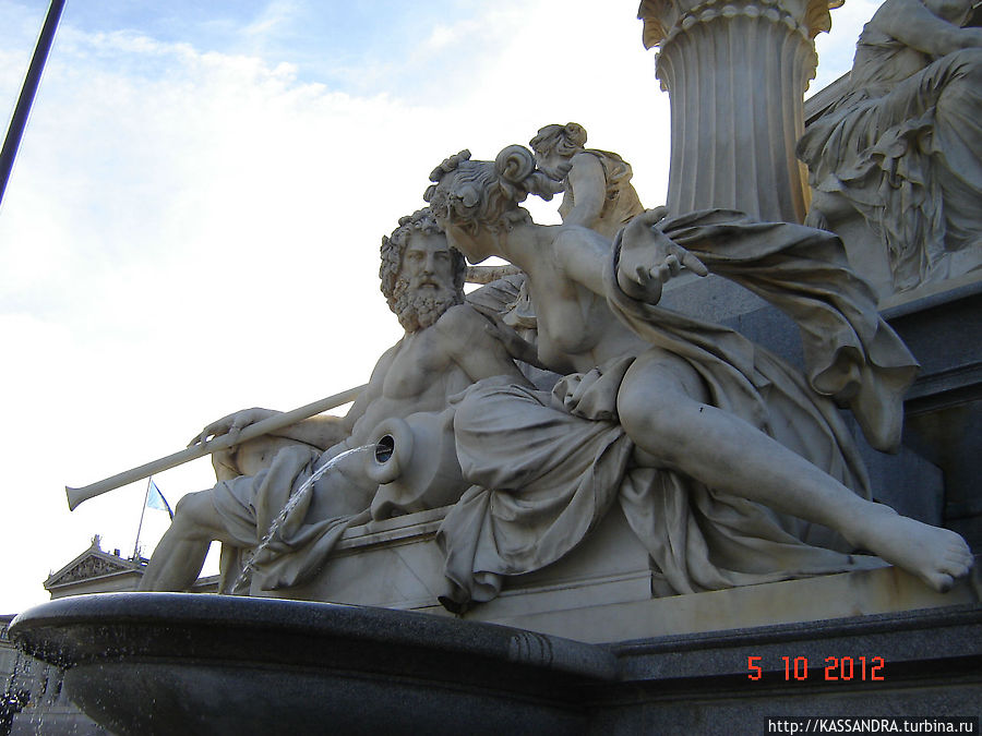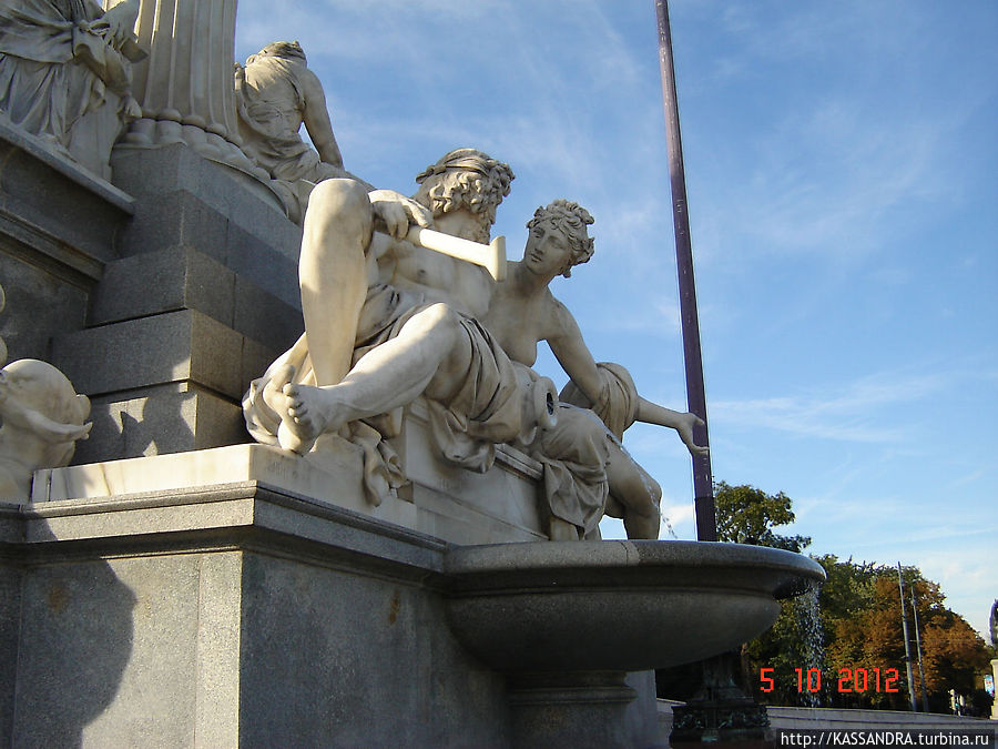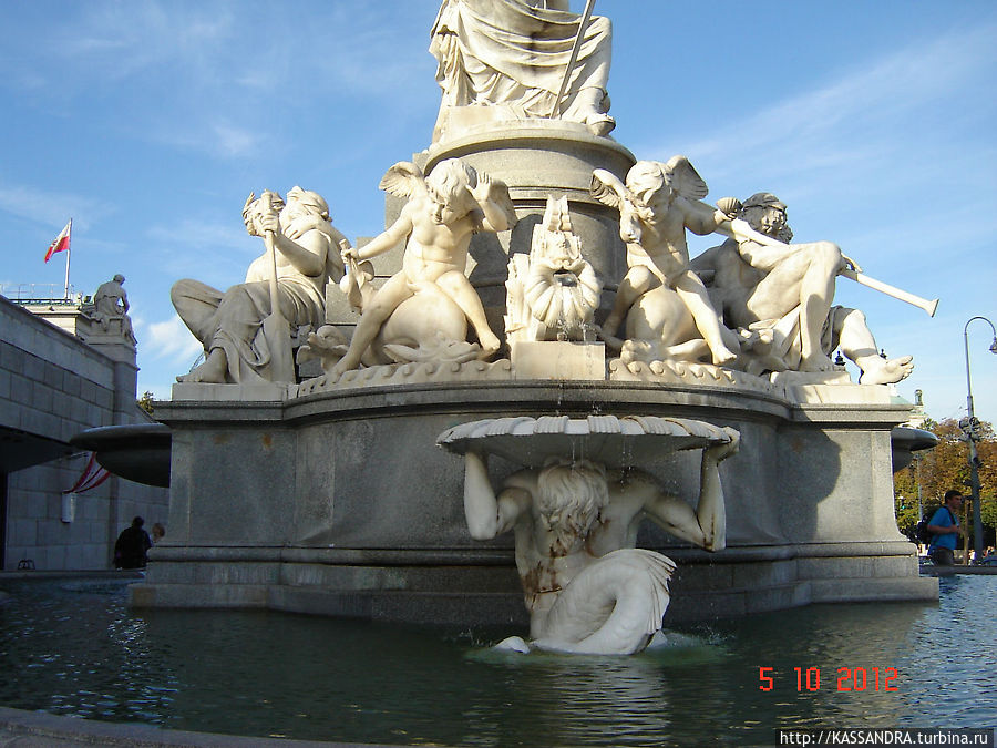 Реки Австрии должны были символизировать сферу деятельности парламента, земли на которые распространяются его законы. Фигуры четырех дельфинов с крылатыми всадниками ангелов дополняют общую композицию фонтана, сглаживая и объединяя все его элементы.