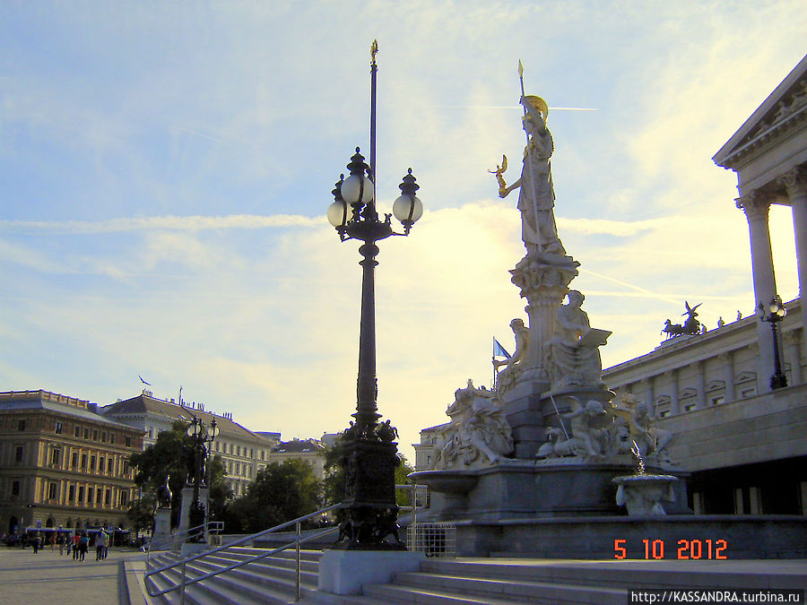 Высокая-5,5 метровая статуя Афины Паллады издалека кажется отдельным украшением здания и площади перед ним.