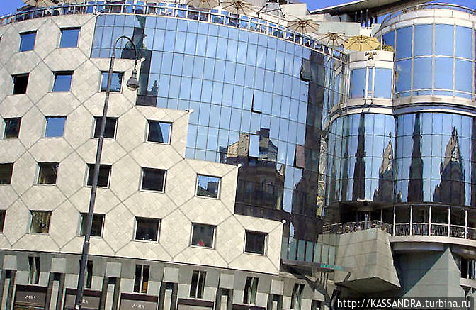 Многие жители Вены были против этого современного мозаичного бетонного здания в центре города, где все напоминает о гениальных зодчих и о старых временах смерти и скорби. Все памятники и фонтаны, лепные украшения домов на улице и даже названия напоминают о тех временах. Здесь витает дух средневековья.Здание, спорно выглядит и с некоторых ракурсах напоминает стеклянный стакан. Но когда ты видишь развернутую картину фасада Дома Хааса, то замечаешь красоту противоречий. Сочетание хрупкого стекла и тяжелого бетона, гладких сферических форм и угловатых колючих многоугольников.
