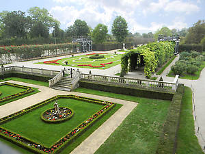 Уходящий вверх по холму дворцовый парк устроен по принципу строгих геометрических форм, с подрезанными кустами и деревьями, с поднимающимися террасами и фонтанами .