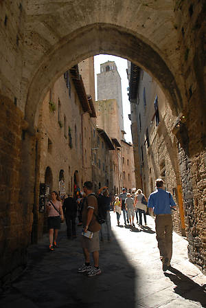Сан-Джиминьяно вообще дорогое место и просто наводненное туристами. Мы приехали в город часам к десяти, так как остановились в отеле с видом на него, и он показался таким удивительным, спокойным, старинным, но уже в два часа по полудне по его улицам было затруднительно передвигаться из-за толп туристов, приезжающих в этот небольшой средневековый город огромными экскурсионными автобусами.