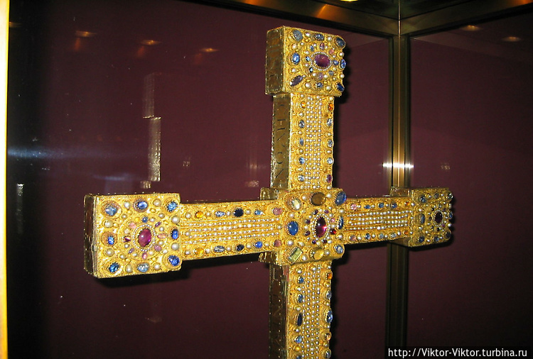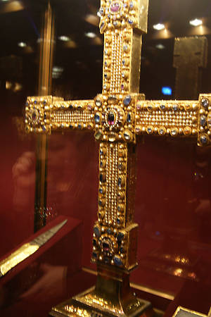 Для хранения имперских святых реликвий, частички Святого Креста и Святого копья, использовался крест-реликварий — Имперский крест. Равноконечный греческий крест, богато украшенный кабошонами и жемчугом, вставленным в золотую филигранную оправу, был изготовлен немецкими ювелирами в 1025 года по заказу императора Конрада. Имперский крест – символ триумфа и победы: по его торцу выгравирована надпись на латыни «При виде Креста Господня злобный враг обратится в бегство и все враги отступят перед тобой, Конрад».