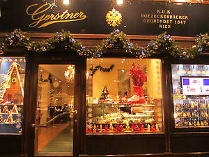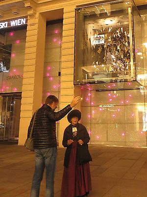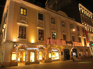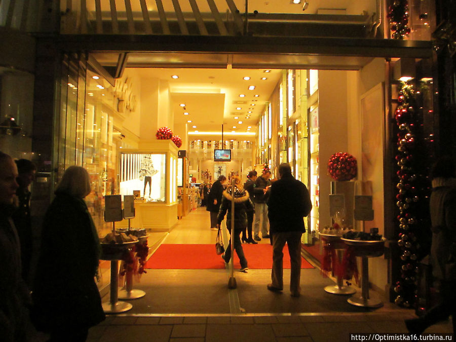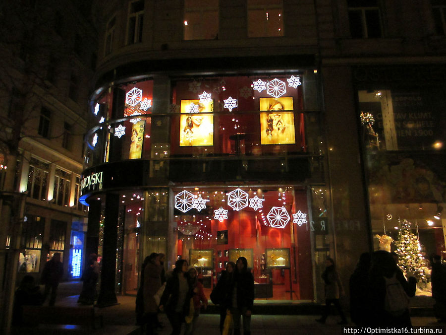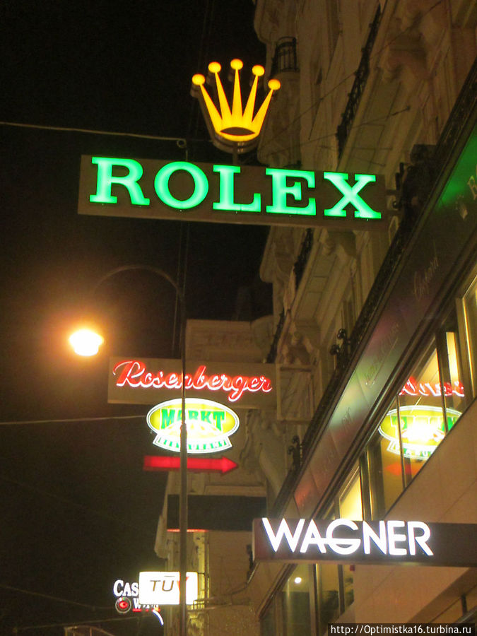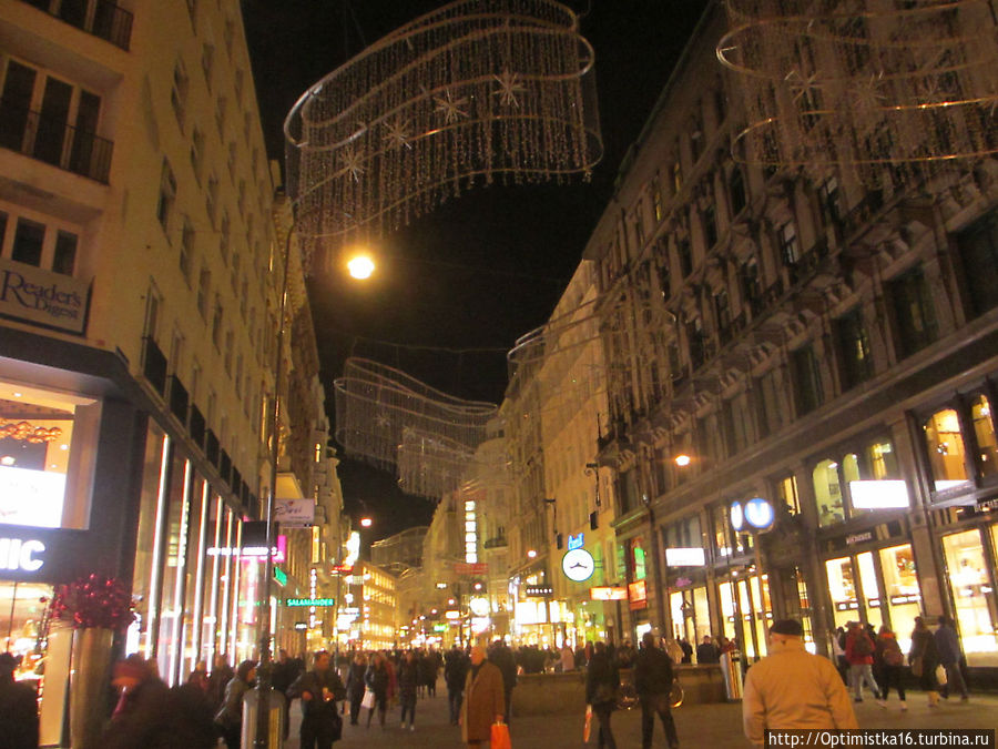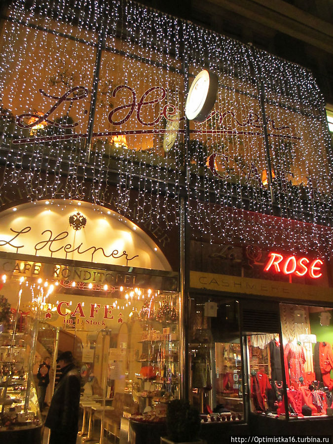 Собор Святого Стефана в вечернем освещении и гербы на крыше, мы пошли дальше по знаменитой торговой улице Кертнерштрассе, глазея на витрины дорогих магазинов изаодно пытаясь найти ресторан "Розенбергер", в котором собирались поужинать. Поиски дались нам нелегко, но завершились удачно. Об этом я написала здесь: