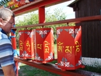 При входе на территорию дацана, нам сразу же показали на дорожку, по которой мы должны были пройти вокруг монастыря по кругу солнца или по часовой стрелке, тем самым совершив обряд очищения и освобождения от мирской суеты. Одновременно надо крутить барабаны-хурдэ, внутри которых лежат свитки с мантрами. Буддисты считают, что прокручивание этих барабанов равносильно молитве. Хурдэ бывают большими и совсем крохотными, крутить их надо тоже по часовой стрелке. Только после этого разрешено войти в храмы.