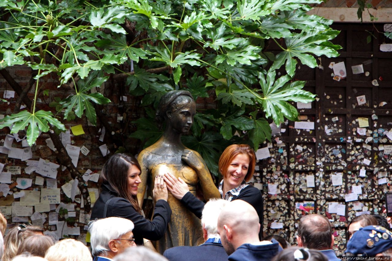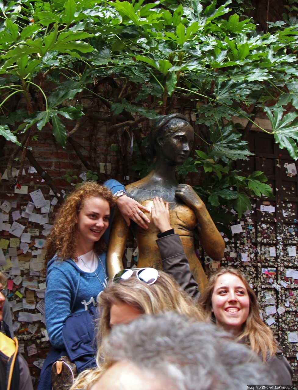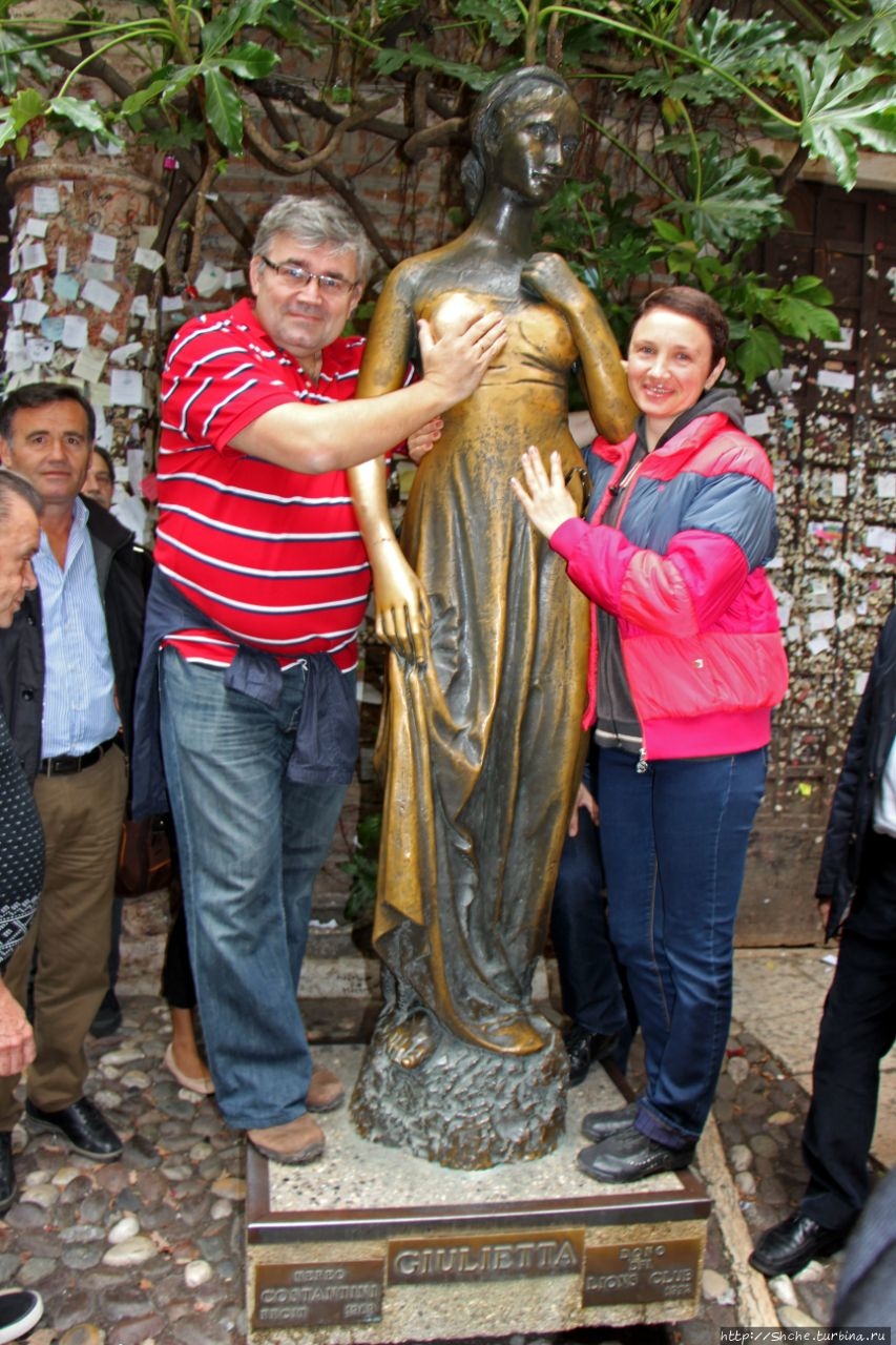 мы посетили это место в октябре 2013 года, потому "потерли" по очереди правую грудь оригинальной статуи. Из-за частых прикосновений к 2014 году статуя была истёрта, на «счастливой» правой груди образовалась трещина, а на правой руке излом. В результате власти города решили убрать ставшую символом Вероны статую в музей, а во дворе дома Джульетты установлена копия.