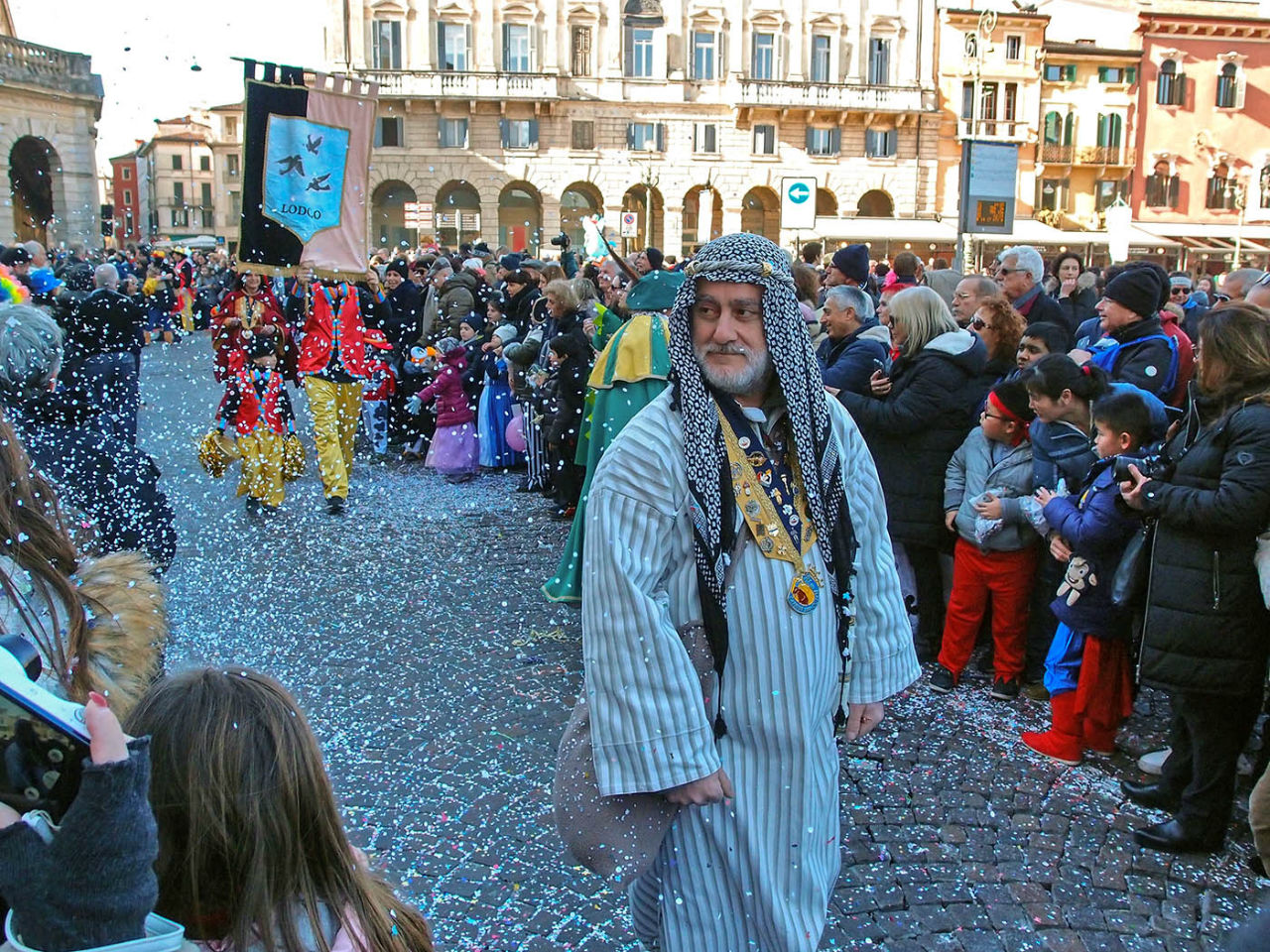 В Верону мы приехали незадолго до начала шествия, и проходя вдоль крепостной стены, наблюдали, как местные жители стягиваются в центр города, а из автомобилей выбираются наряженные детишки.
