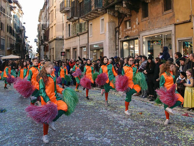 Судя по всему, в веронском карнавале охотно принимают участие иностранцы. Так, мы видели инвалидов-колясочников из Израиля, надевших в клоунские парики. Эта группа быстро проезжала под общие аплодисменты.
