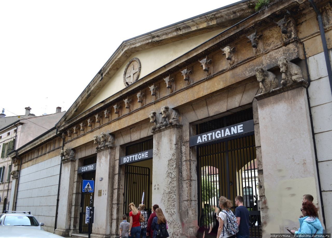Они же украшают и фриз фасада. Здание было построено ещё в 17 веке, а перестроено в середине 19. Такое украшение было закономерным, сначала здесь находился карантин для всех товаров и животных, что поступали в город по реке Адидже, а 150 лет назад здесь находилась скотобойня, в реконструированных помещениях можно было содержать туши различных животных (коровы, свиньи, овцы, лошади, кролики и куры).