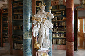 К 1744 году библиотечный зал был расписан фресками Мартином Куном, а скульптуры вырезаны из дерева мастером Домиником Хербергером. Мне они показались немного наивными, и, как оказалось, они олицетворяют аллегории человеческих знаний и божественной мудрости.