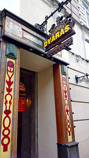 На обед мы зашли в рекомендованный «турбиной» ресторан литовской кухни «Forto Dvaras». Очень рекомендую посетить сие заведение. Спускаетесь вниз по ступенькам, если не страдаете клаустрофобией, и наслаждаетесь местными изысками в казематах средневекового Вильнюса, ну либо пытаетесь занять места у окошечка.