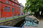 Этот кирпичный мост, да и целую дорогу за мостом назвали Schweinsbrücke über der Grube, или "Мост свиньи через яму". В 1994 году его полностью перестроили. И не только сохранили утратившее свое значение название, но еще установили бронзовые скульптыры свиней.