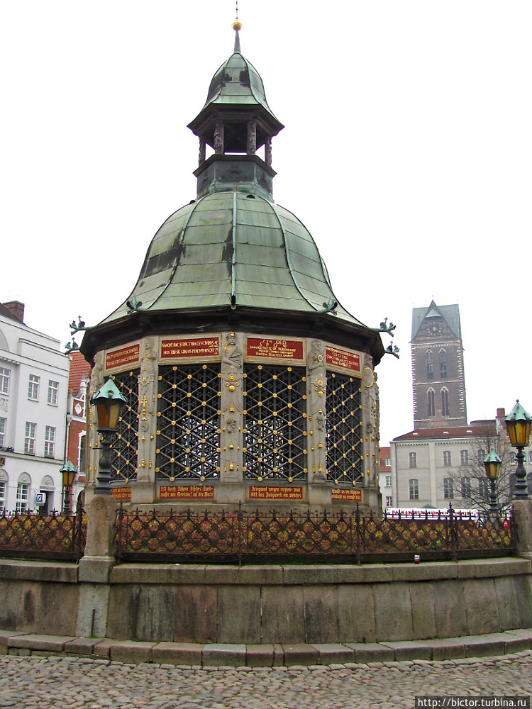 Оглянувшись на площади, в глаза сразу бросились 3 объекта. Первым был красивейший колодец в центре площади. Построенный по проекту голландского архитектора в конце 16-го века он давал напиться водицы колодезной жителям Висмара вплоть до начала 20-го века, когда больше это стало не модным. Гравированные надписи на нем, на латинском и немецком, рассказывают об истории добычи питьевой воды в те времена.