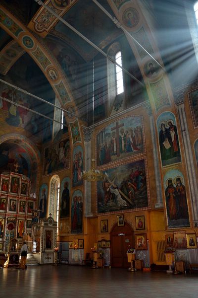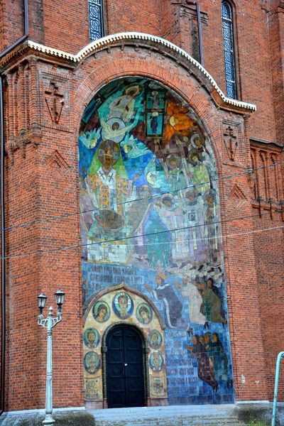 отделки — только красный узор и ажур из кокошников на колокольне. Всё очень строго и волнующе торжественно. Почему, даже цветные панно не дают ощущения счастья и лёгкости, почему апсиды и высокие барабаны с золотыми куполами устремлёнными в небо напоминают языки пламени?
