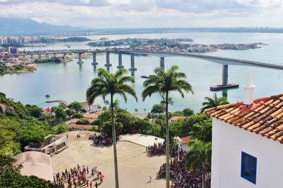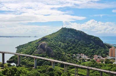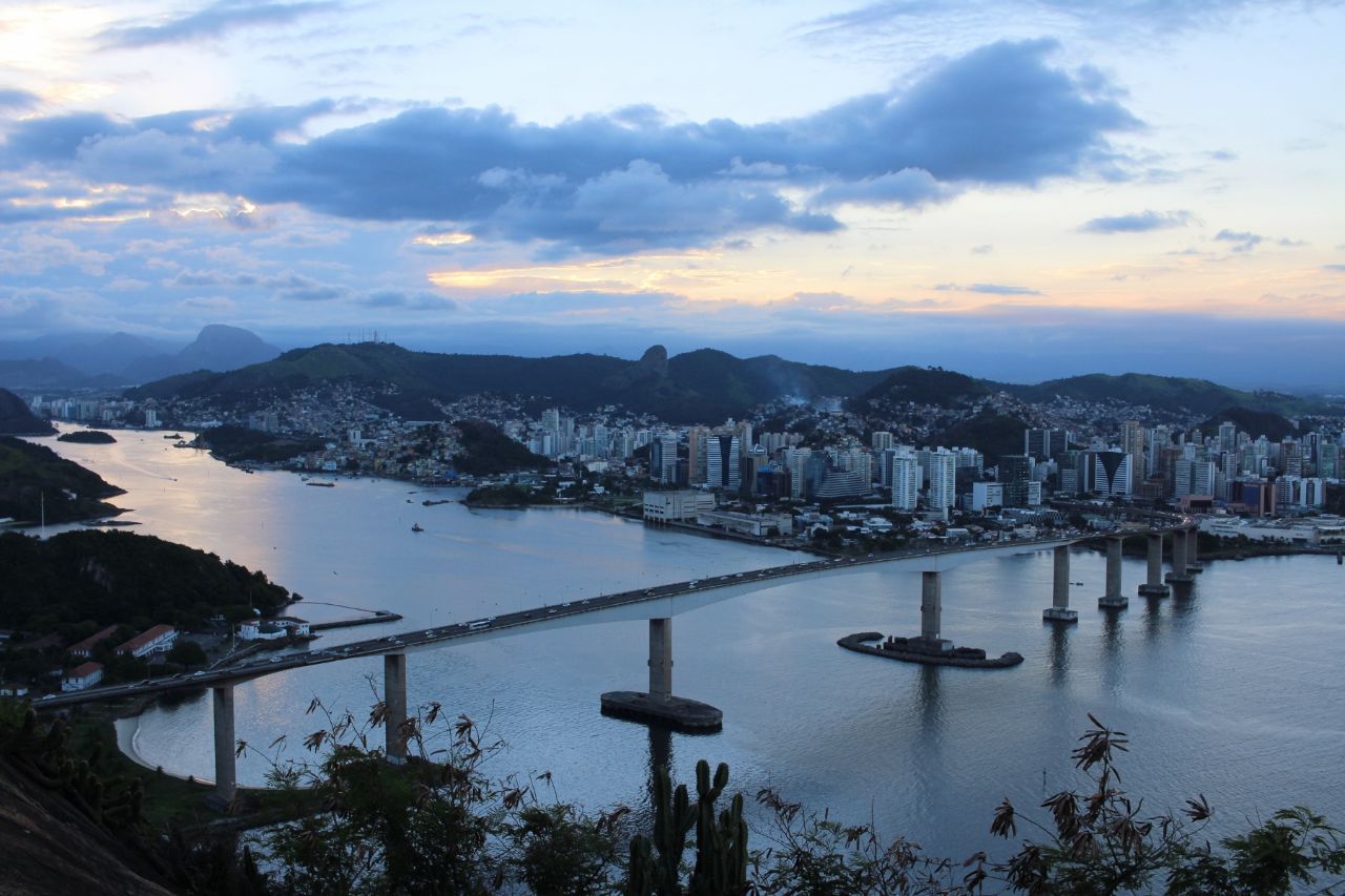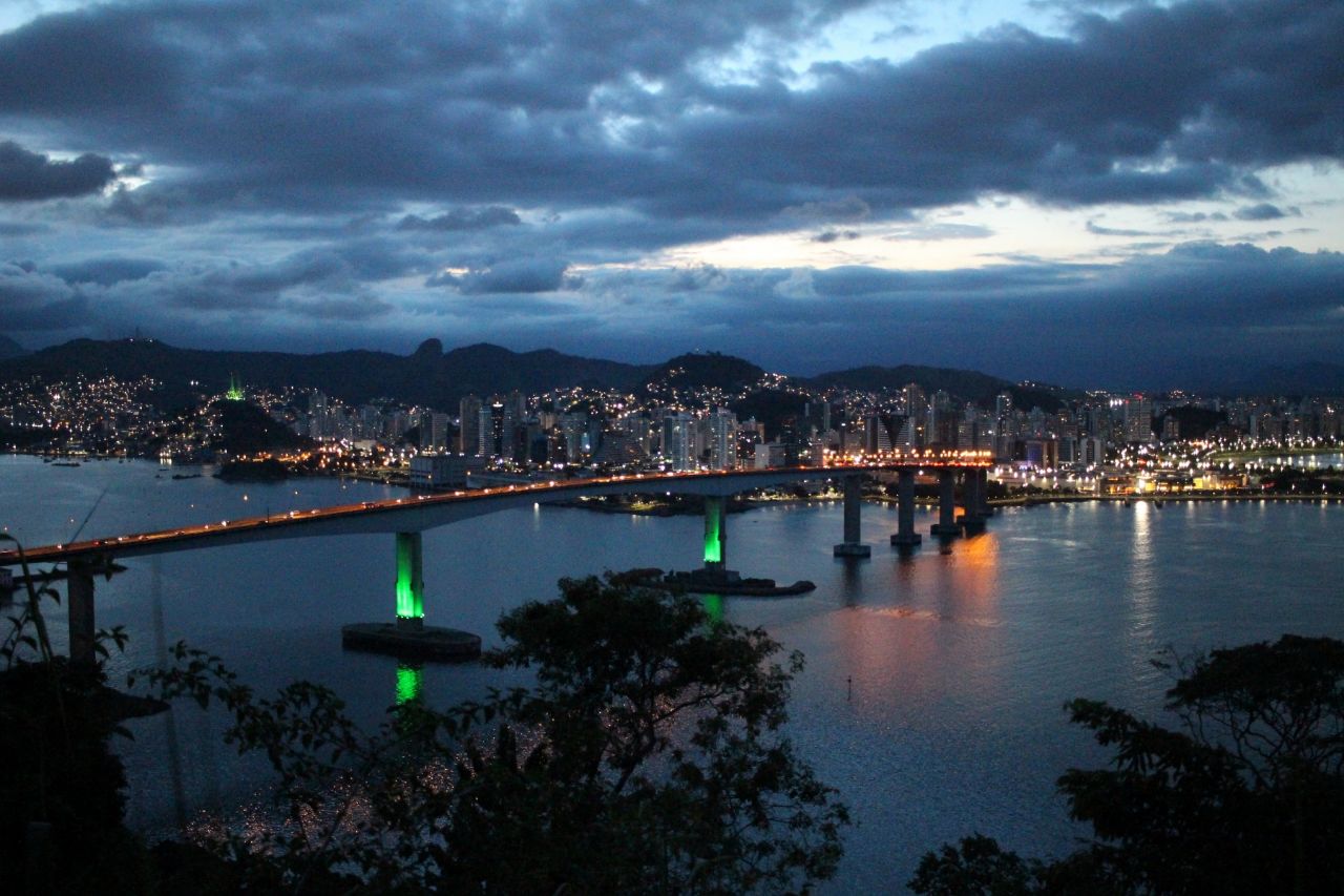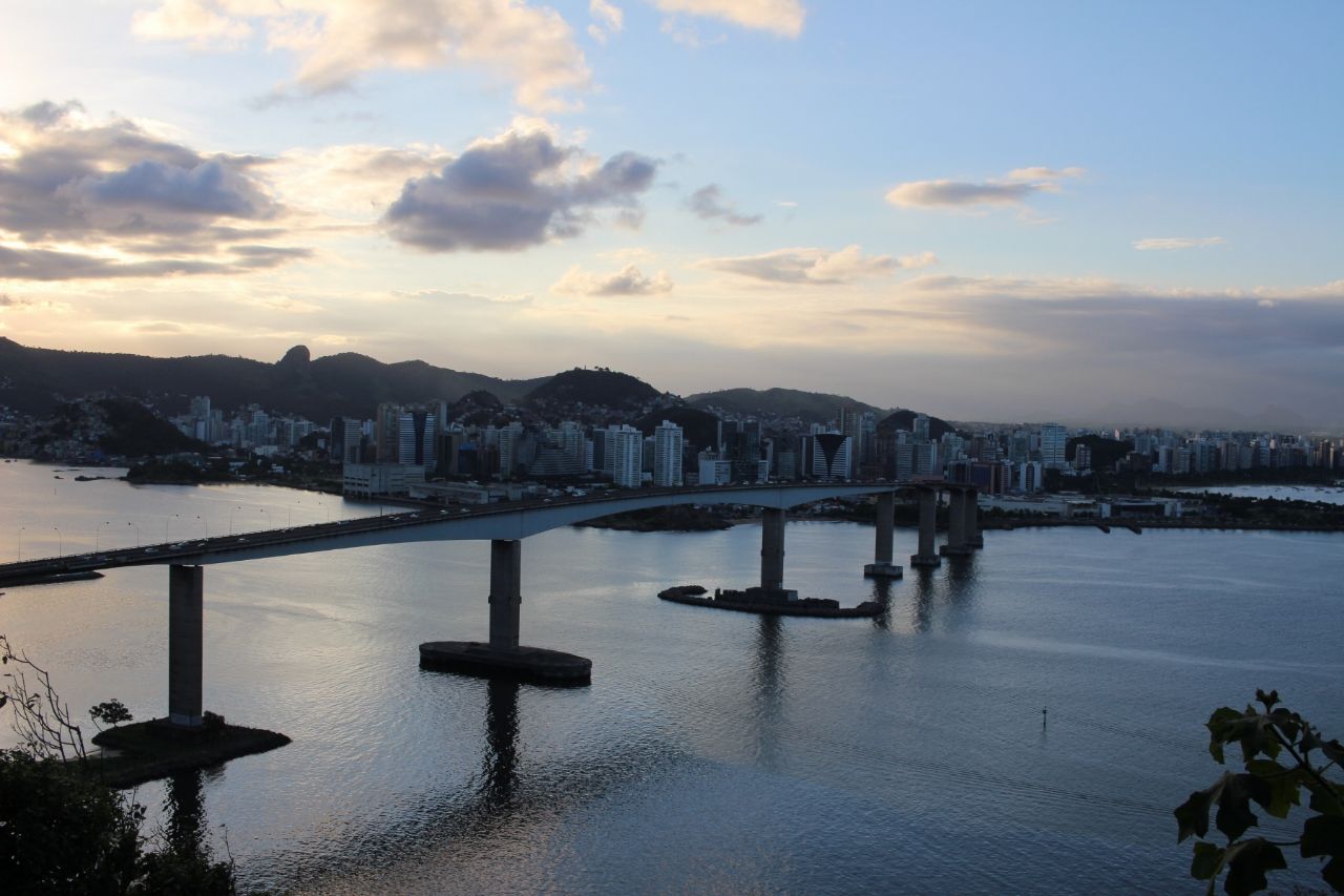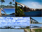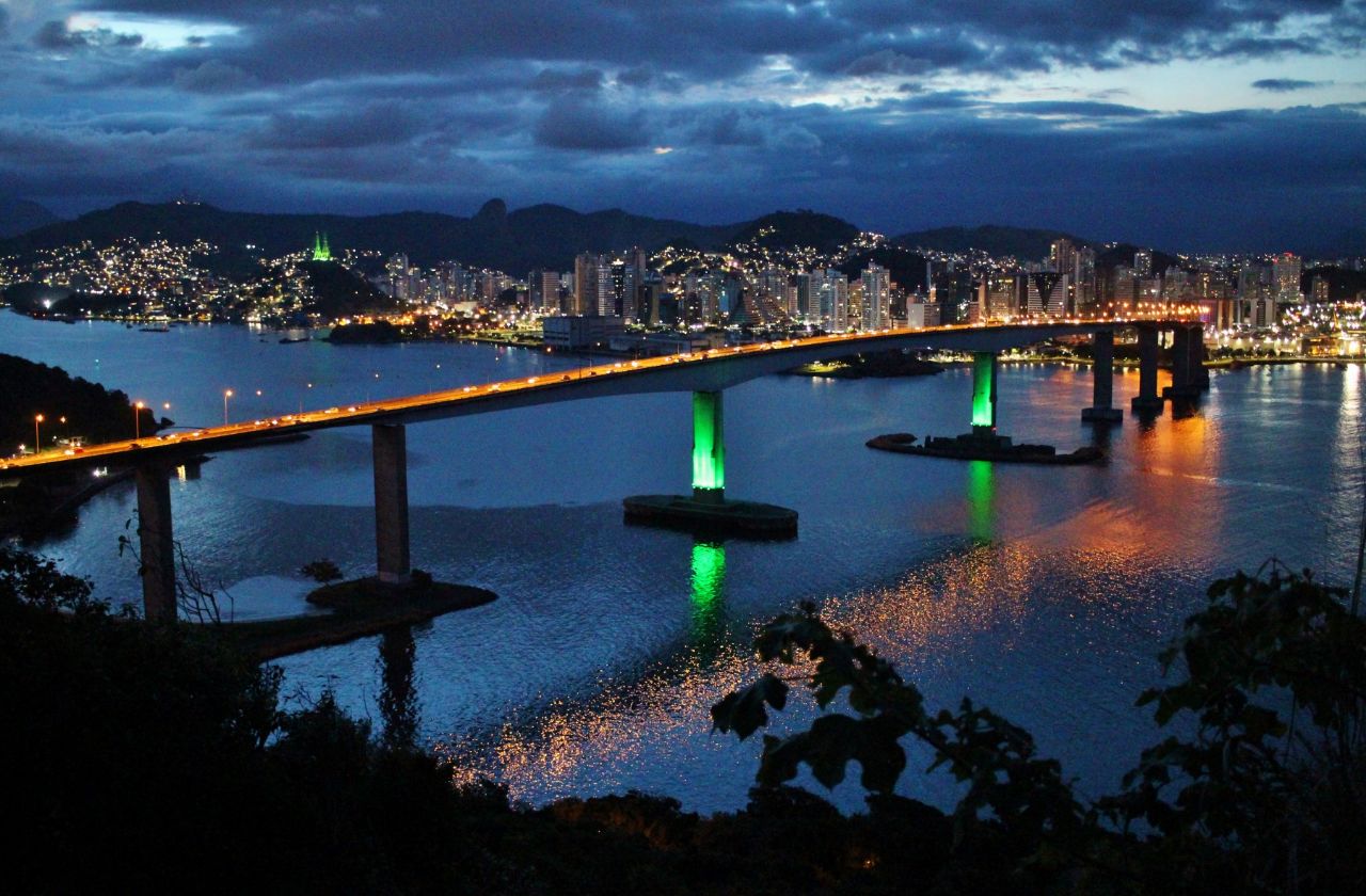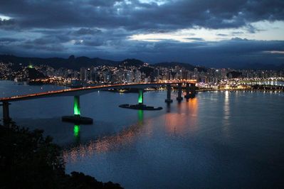 Этот мост был построен в 1978-1989 годах, и его официальное название Ponte Deputado Darcy Castello de Mendonça. Но более популярно совсем простое: "Terceira ponte" ("Третий мост"). Первый мост через этот канал был построен ещё в 1928-м году, в восьми километрах западнее (у старого центра Витории), а второй в 1979-м рядышком с ним. И только эта монументальная полупетля над самой горловиной грубоко врезавшегося залива позволила открыть прямую дорогу из Витории на юг вдоль самого берега Алтантики.